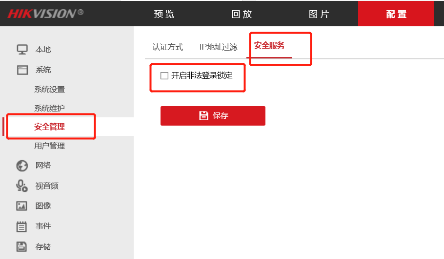 登錄海康相機(jī)web界面,配置---系統(tǒng)---安全管理---安全服務(wù),關(guān)閉非法登錄鎖定功能,點(diǎn)擊“保存”;